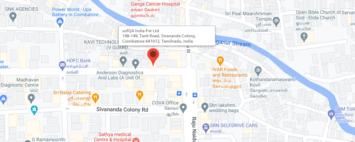 From Gandhipuram Bus Stand take a Left turn on Cross Cut Road and go to NH181 Power House Junction. Continue on NH181 to Dr. Alagappa Chettua RD to Ooty Bus Stand (Tank Road Junction) take left turn on Sivananda Colony Tank Road and Go straight for 30 meters on the right hand side you will see a HDFC Bank and opposite is TechUnity Software Systems India Pvt. Ltd., Building adjacent on the Left side is sofQA India Pvt Ltd. From Ooty Bus Stand (Tank Road Junction) take left turn on Sivananda Colony Tank Road and Go straight for 30 meters and on the right hand side you will see a HDFC Bank and opposite is the sofQA India Pvt Ltd.